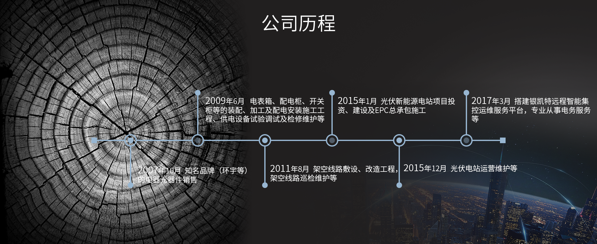 多年来,银凯特一直专注于输配电工程项目总承包,光伏新能源电站投资、建设、运营、维护等业务,并致力于打造互联网+城市电力智慧管理暨智能安全电务运维服务平台新模式。